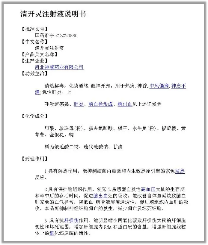 舉個例子,現在中國應用最多的“清開靈注射劑”,它的説明書上這樣寫: