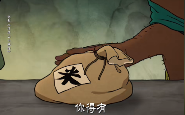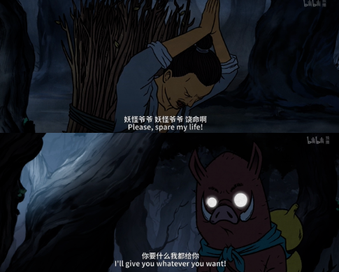 電影開頭,是小野豬在浪浪山打劫賣炊餅的人。