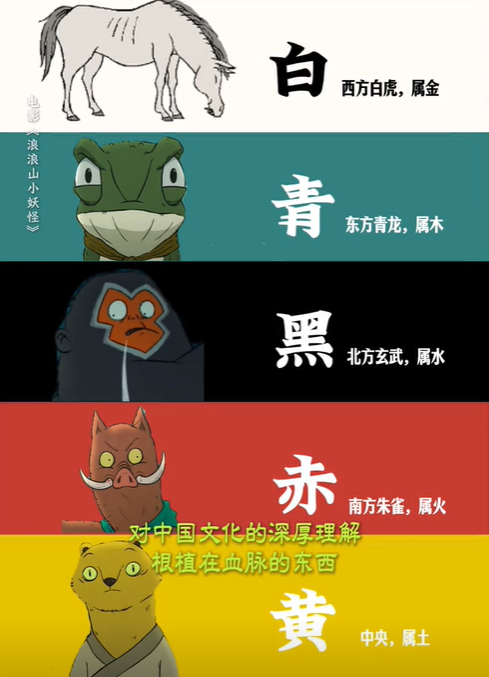 小豬妖的赤(火)、蛤蟆精的青(木),猩猩怪的黑(水)、黃鼠狼的黃(土),還有白(金)色的馬,對應的就是金木水火土的顏色。