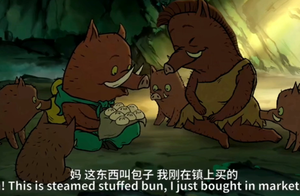 當小野豬又一次回到家,給媽媽帶來了菜包子。小小豬妖吃了一口之後,把菜包子都端走了。