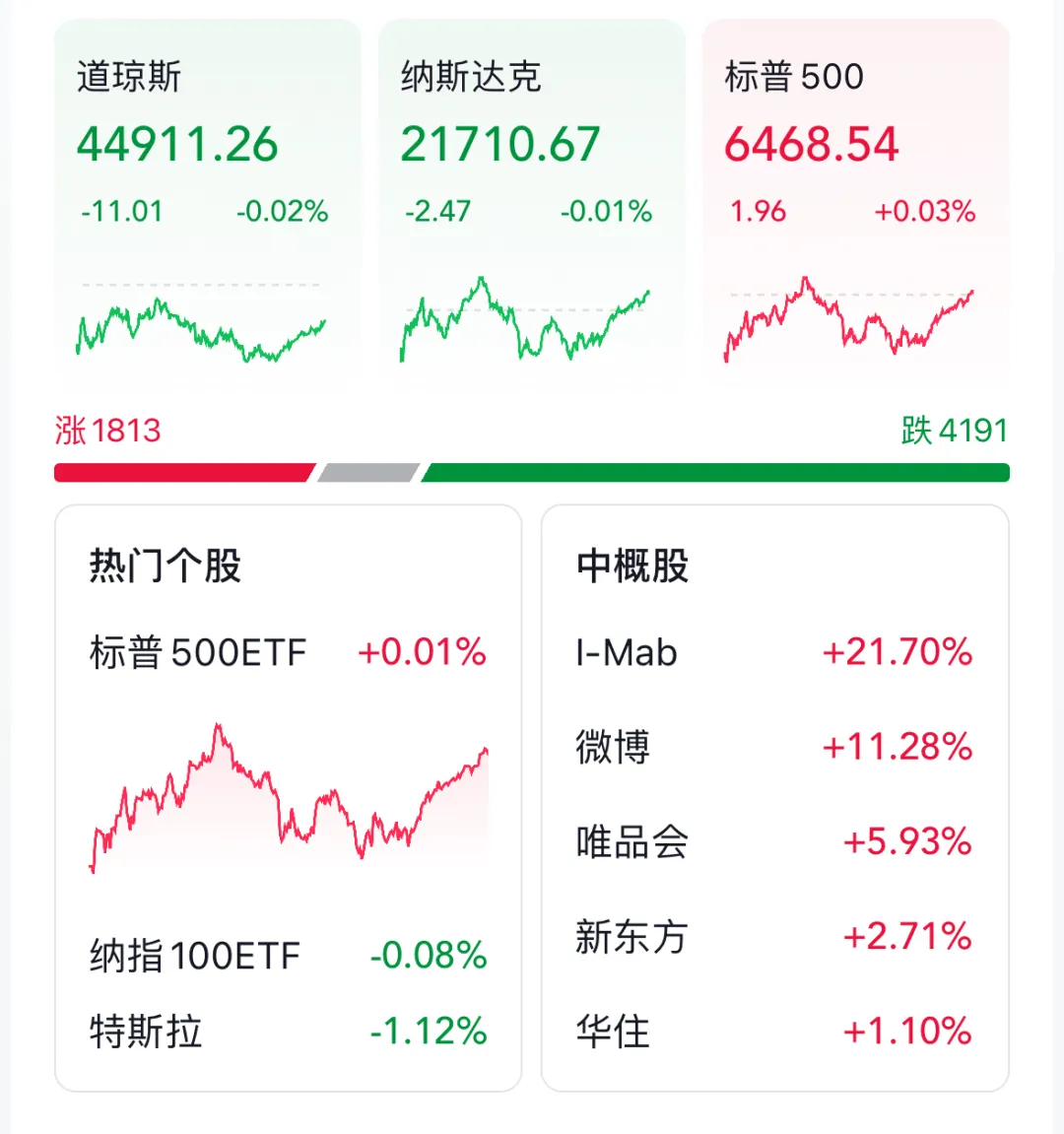 **【美股】**截至收盤,道指跌11.01點,跌幅為0.02%,報44911.26點;納指跌2.47點,跌幅為0.01%,報21710.67點;標普500指數漲1.96點,漲幅為0.03%,報6468.54點。英特爾(INTC.US)漲7.38%,納斯達克中國金龍指數跌2.13%,阿里巴巴(BABA.US)跌3.64%。