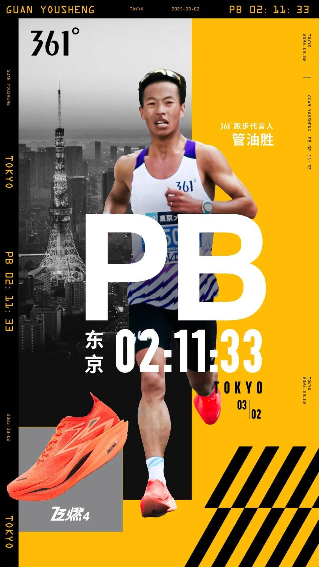 跑步領域,361°深度參與青島馬拉松、衝浪城馬拉松等專業賽事,專業競速跑鞋矩陣屢創佳績,2025年上半年助力運動員85次登上領獎台。其中跑步代言人管油勝在2025東京馬拉松上強勢PB並摘得中國籍男子第三的好成績,不斷加固品牌在專業跑圈的信任基礎。