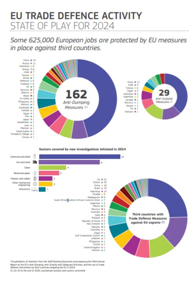 根據歐委會7月底發佈的2024年貿易防禦工具報告顯示,其貿易救濟措施運用達到“歷史高位”,共維持199項反傾銷、反補貼及反規避措施,針對中國也更加明顯:在162項反傾銷措施中,有關中國74項;29項反補貼措施中,涉華多達11項。****