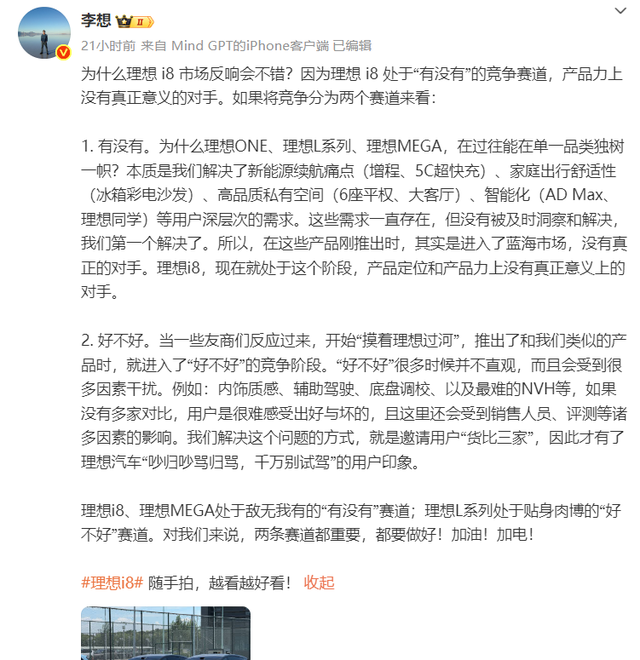 8月14日李想髮長文總結理想i8,其表示理想 i8 處於“有沒有”的競爭賽道,產品力上沒有真正意義的對手。