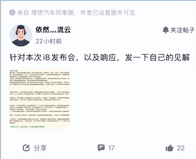 此前曾有理想員工發表了自己對理想i8發佈會的見解,這其實很值得理想高管去覆盤。
