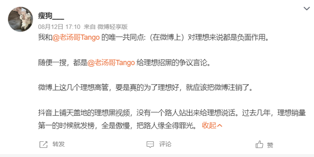 可以看到目前有部分網友也感受到了湯靖言論的負作用,有網友稱微博上這幾個理想高管,要是真的為了理想好,就應該把微博註銷了。抖音上鋪天蓋地的理想黑視頻,沒有一個路人站出來給理想説話。過去幾年,理想銷量第一的時候就發榜,全是傲慢,把路人緣全得罪光。