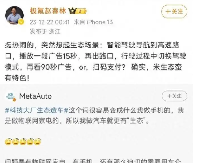 極氪副總裁趙春林甚至還陰陽起了友商,他表示米生態蠻有特色,突然想到生態場景,智能駕駛導航到高速路口,播放一段廣告15秒,再出路口,行駛過程中切換駕駛模式,再看90秒廣告。