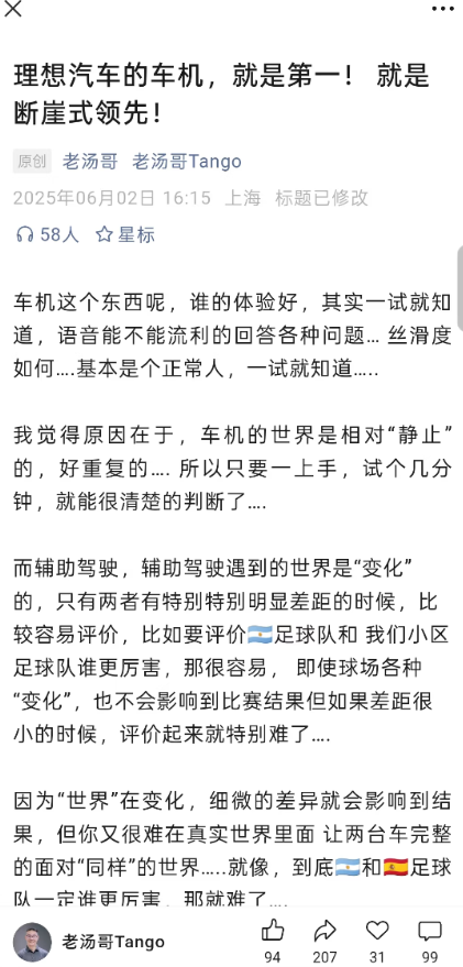 譬如針對車機,理想湯靖曾表示理想汽車的車機,就是第一!就是斷崖式領先,這種沒有權威性評測的自誇,很容易引起部分消費者的反感。