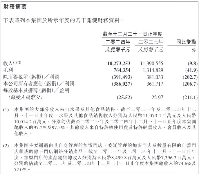 在這樣的惡性循環下,百果園在2024年經歷上市以來的首次虧損,淨虧損達到3.86億元。或許正是因為這些壓力,餘惠勇才會被逼急了,説出“教育消費者”的觀點。