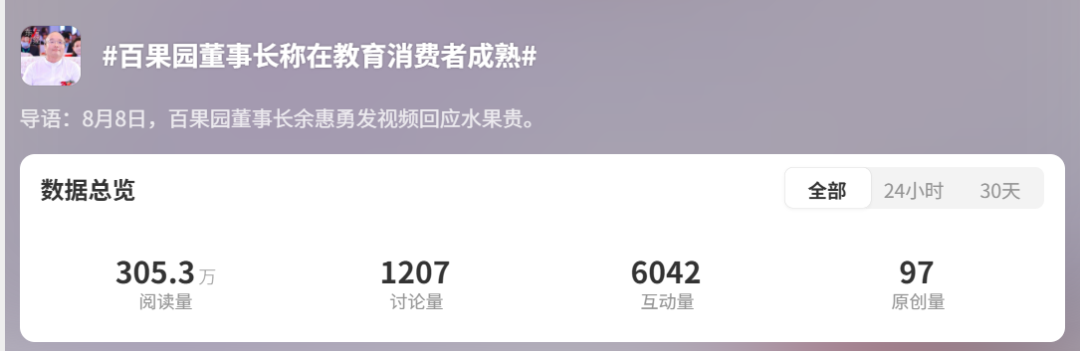 儘管百果園緊急澄清稱“斷章取義”,但依然阻擋不了百果園多次登上熱搜的趨勢。#百果園董事長稱在教育消費者成熟#話題已有超300萬閲讀量,大部分消費者在留言中吐槽百果園,幾乎呈現出一邊倒的差評態勢。