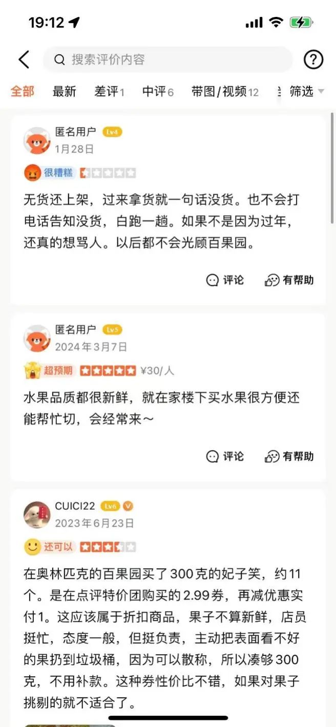2023年,有消費者在抖音上發視頻吐槽,自己在百果園使用團購券購買西瓜,卻遭遇了店員的嘲諷,稱“撿便宜買的西瓜會不甜”。在美團上,各家百果園的評價褒貶不一,有用户稱讚百果園水果新鮮,也有用户表示差別不大,甚至買到了發黴水果。