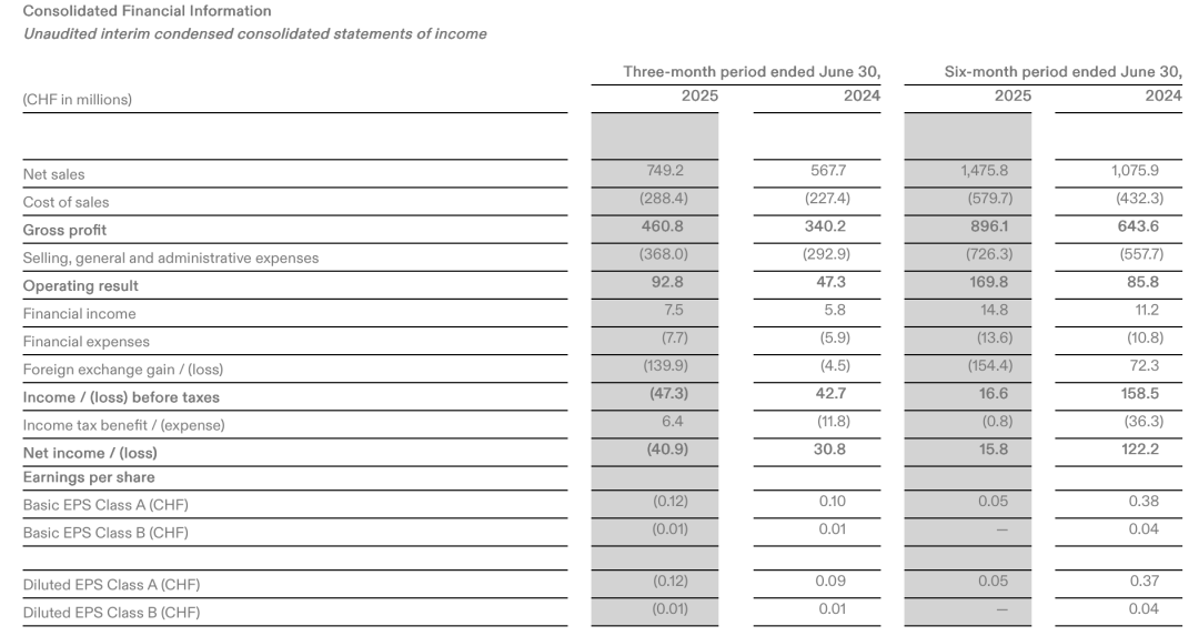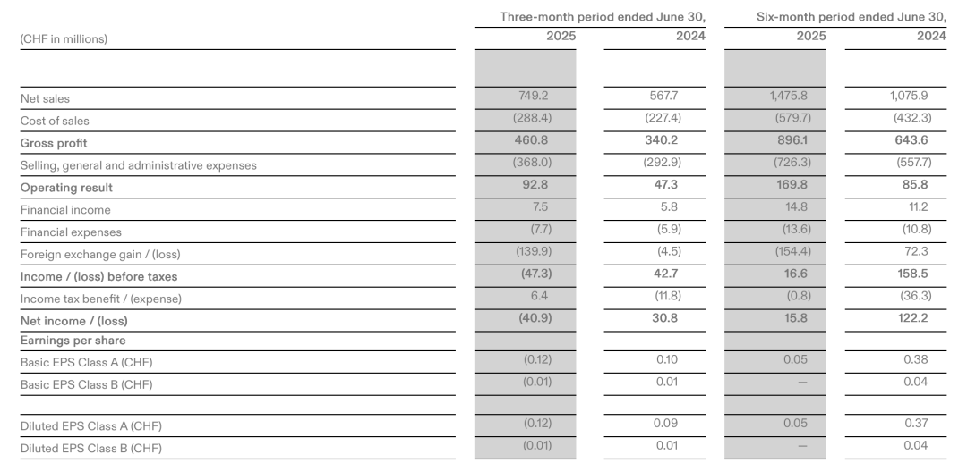 2025年上半年,昂跑淨銷售額為14.76億瑞士法郎,同比增長37.2%;淨利潤為1580萬瑞士法郎,下滑87.1%;淨利率為1.1%,而在去年同期,這一數據為11.4%。