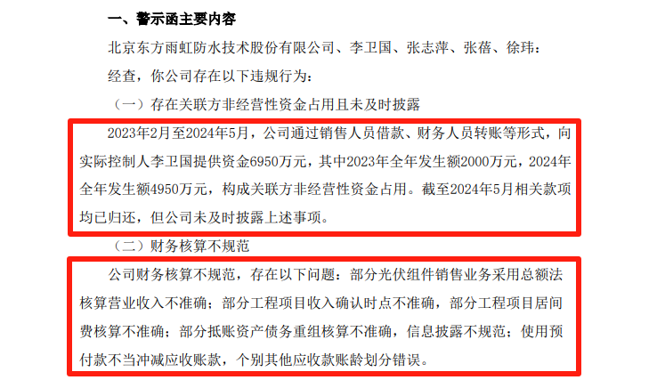 2023年2月至2024年5月,東方雨虹通過銷售人員借款、財務人員轉賬等形式,向李衞國提供資金6950萬元,構成關聯方非經營性資金佔用。但東方雨虹未及時進行披露。