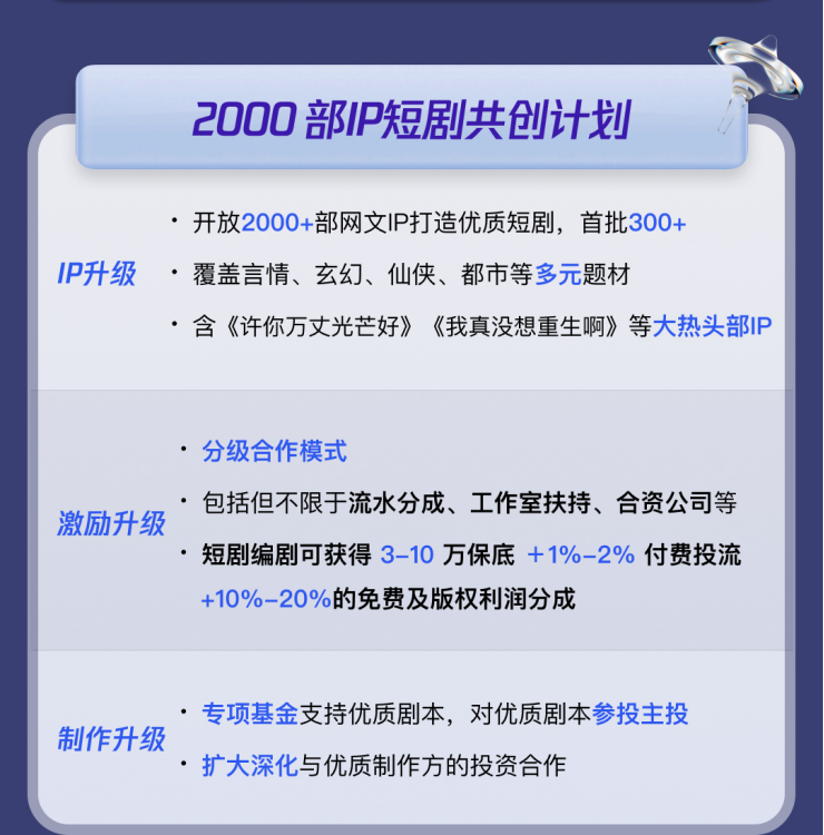 為了吸引更多編劇加入,玩家還推出了頗具吸引力的分級合作模式,例如閲文提供了保底收入、流水分成乃至工作室扶持和合資公司機會,單劇本保底可達3-10萬元,並享有1%-20%不等的多元利潤分成。