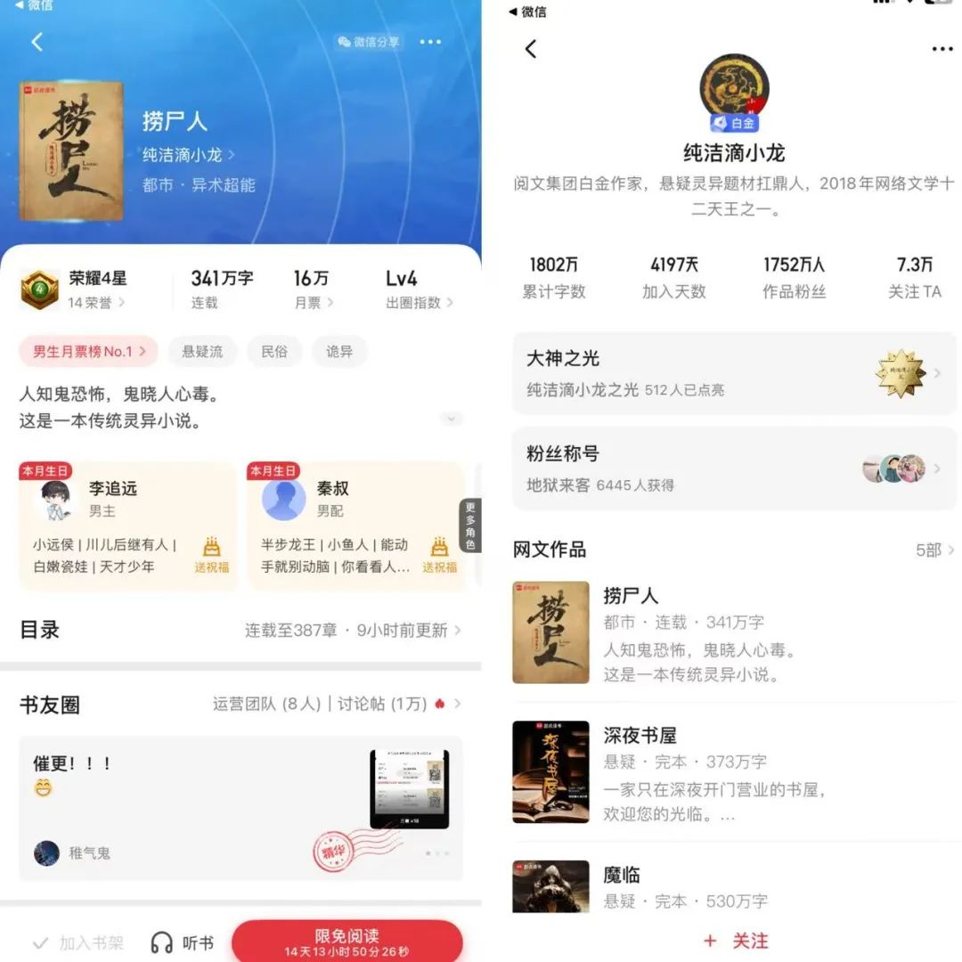 以“純潔滴小龍”的《撈屍人》為例,這部作品講的是民俗懸疑,題材不算熱門,但故事講得夠精彩、夠抓人,一樣能火出圈,今年3月其一舉斬獲34.6萬張月票,刷新起點讀書四年紀錄,均訂量同步突破十萬大關。