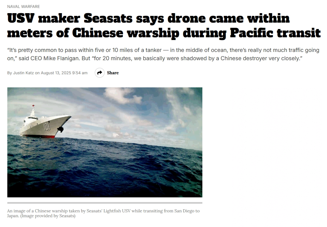 當然,按照Seasats公司的説法,他們的無人艇,是在自主航行的過程中,被中國海軍首先發現的,然後“南昌”艦還跟在Lightfish無人艇後面開了一段時間,確認沒有問題之後掉頭離開。