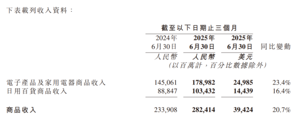 再從產品品類角度看,去年二季度,京東的電子產品和家電收入同比下降了 4.6%,受益於國補,本季度同比增長 23.4%。相比之下,沒有國補的日用百貨收入增長就不明顯,為 16.4% 。