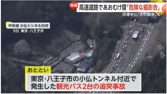 4/5那天上午東京八王子市中央自動車道(高速公路)南下線小佛隧道口發生觀光巴士追撞事件,事故導致47人受傷,傷者皆為外國遊客。