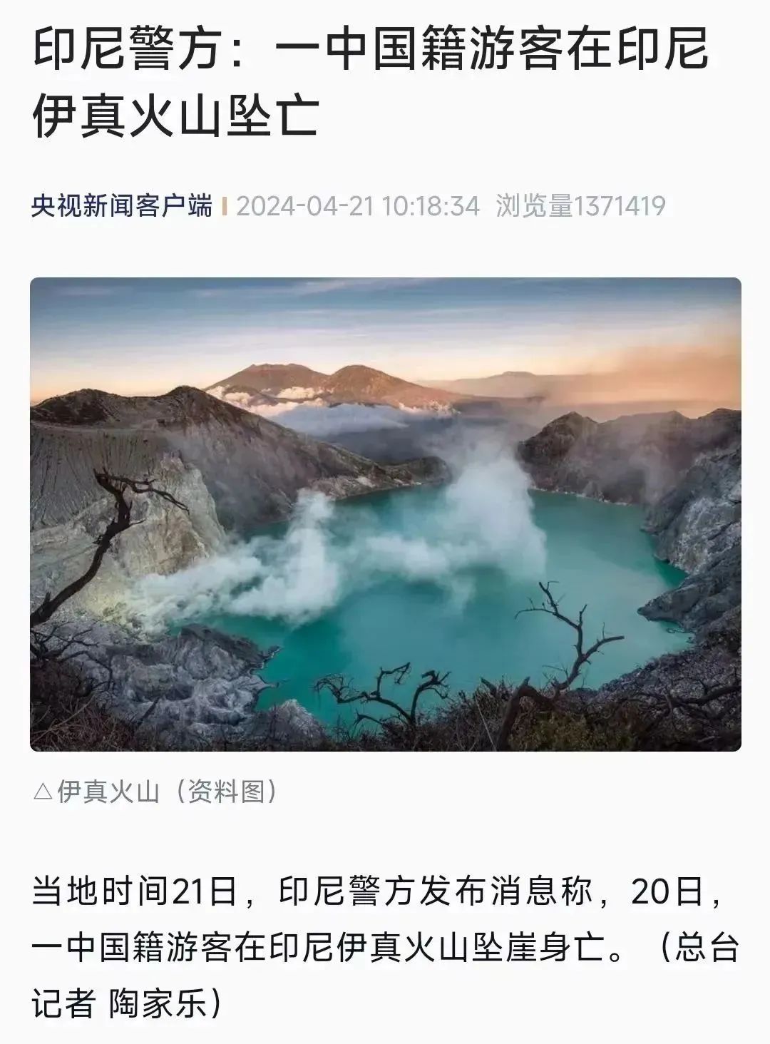 2024年4月20日,一位中國女遊客印尼火山口拍照,被長裙絆倒墜崖身亡……