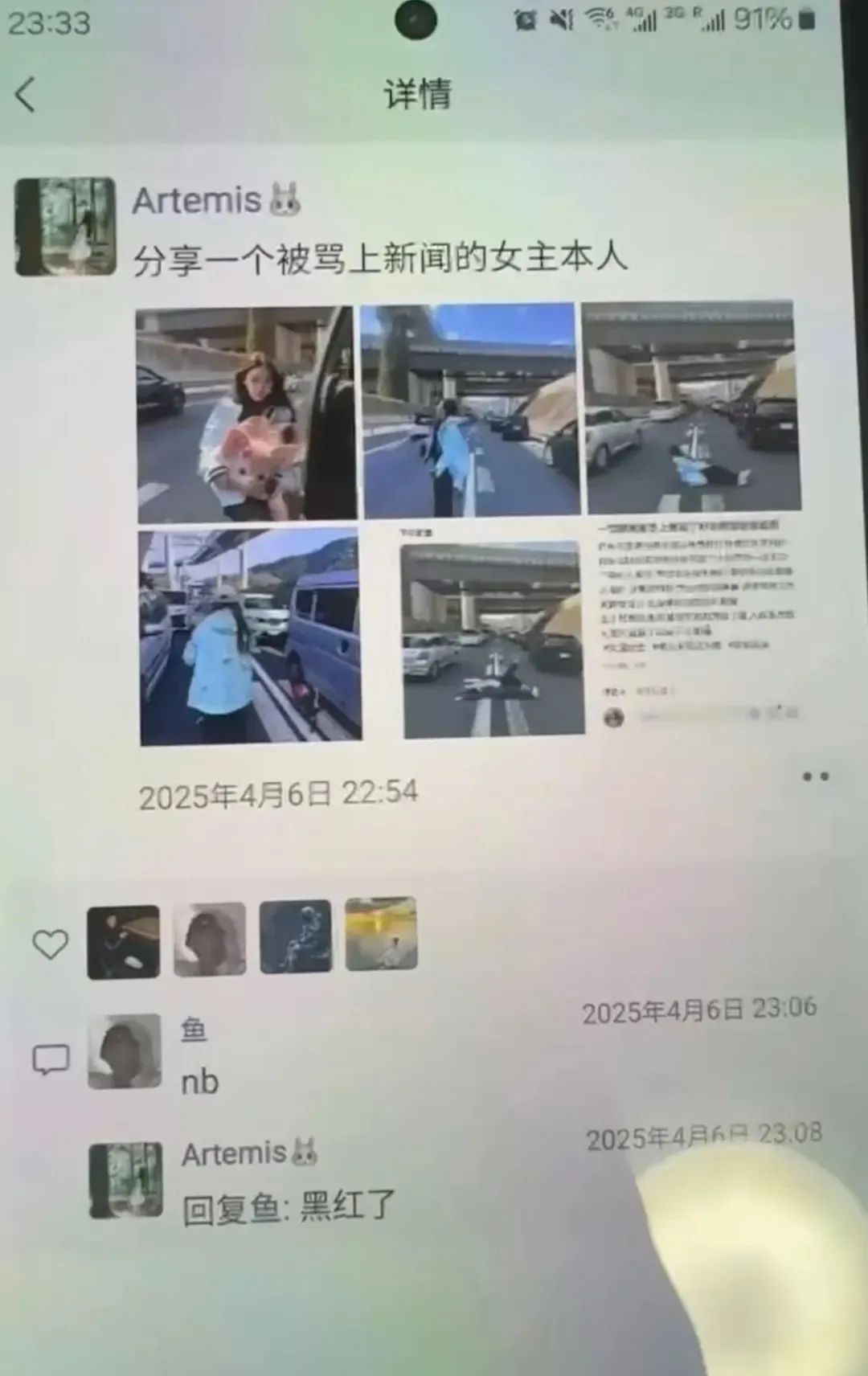 原來在車禍後交通受阻期間,帖主和另一名女子躺在高速馬路上拍照打卡:散步、遛狗、躺在地上。