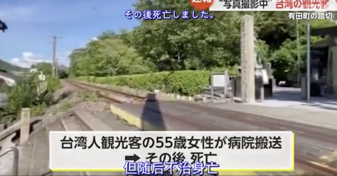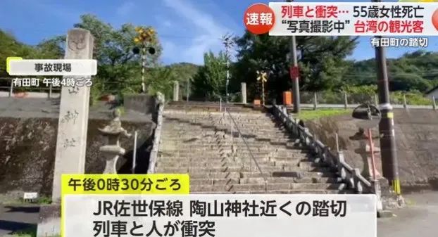 8月13日下午12點30左右,一名55歲中國台灣女遊客在日本佐賀縣一神社前的平交道上被列車撞擊身亡。