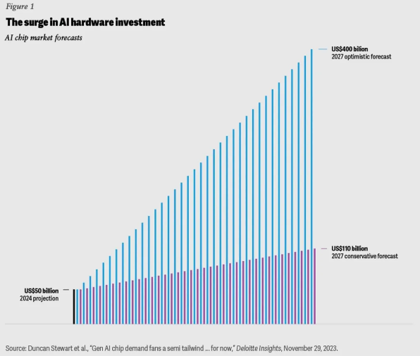 德勤預計到2027年全球AI芯片市場將達4000億美元,保守預計1100億美元。而中國作為全球第二大算力國家,工業經濟體系極為龐大,AI算力需求呈指數級增長。