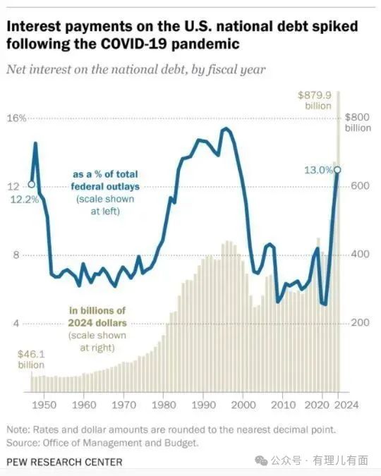 而且美國政府2024財年支付的淨債息已達到8799億美元,佔當年財政總支出的13%,不僅創下25年來的最高比例,甚至已經超過了8741億美元醫保支出和8735億美元的軍費支出。