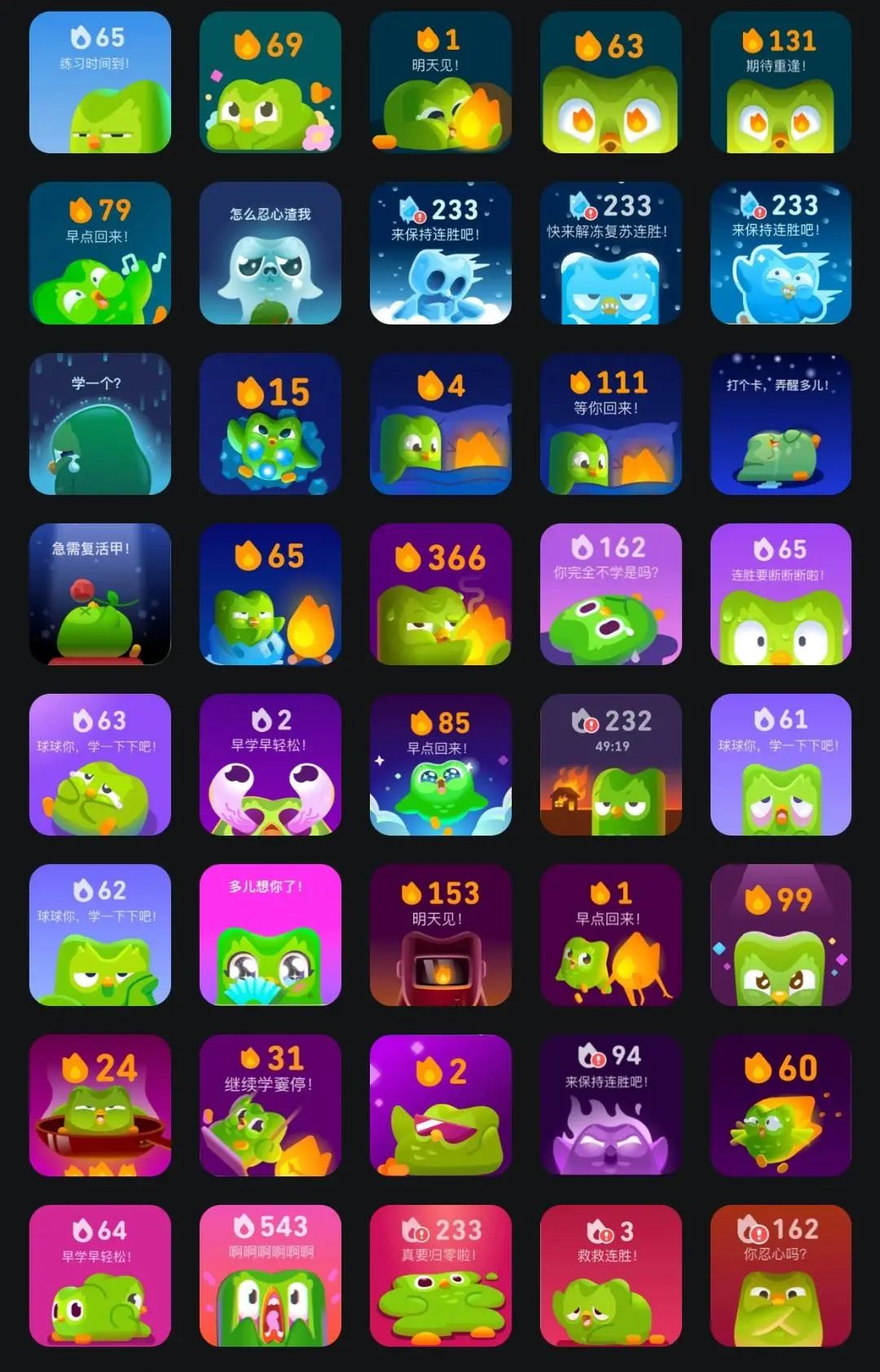 他不是在峽谷激戰,也不是刷短視頻上癮,而是怕被一隻綠色貓頭鷹追殺——畢竟,只要有一天不登陸APP學習,這隻名叫“Duo(多兒)”的綠色貓頭鷹就會開始大變身,還會向你發來催促的短信:“每次你漏學,我都心痛到無法呼吸!”