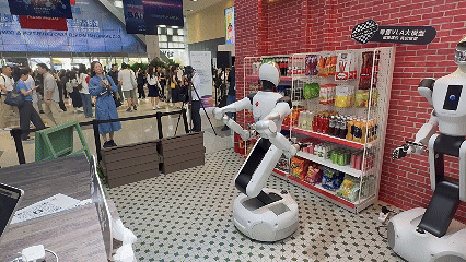 人形機器人越來越快地撕下了“大號遙控玩具”的標籤,開始比拼“幹實事”的落地能力,展台更是乾脆設置成養老院、商超、工廠流水線等不同場景。