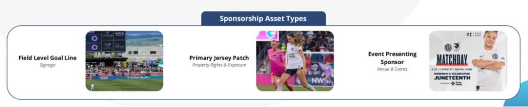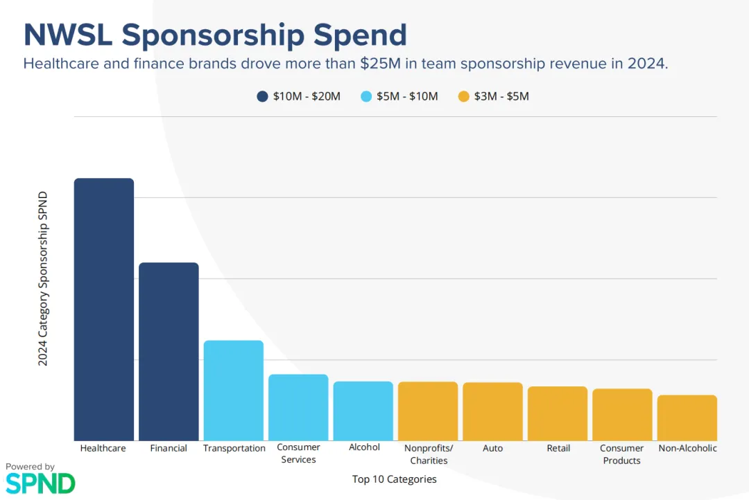 NWSL的商業贊助版圖在持續擴張,贊助商品類也呈現多元化發展趨勢。隨着美國電話電報公司(AT&T)、e.l.f美妝、泰諾(Tylenol)、飲料品牌Unwell Hydration等品牌的加入,聯賽球隊的贊助網絡已覆蓋交通、金融、醫療保健、電信、美妝、汽車等十餘個行業領域,並且達成了平均每筆170萬美元的交易數額。