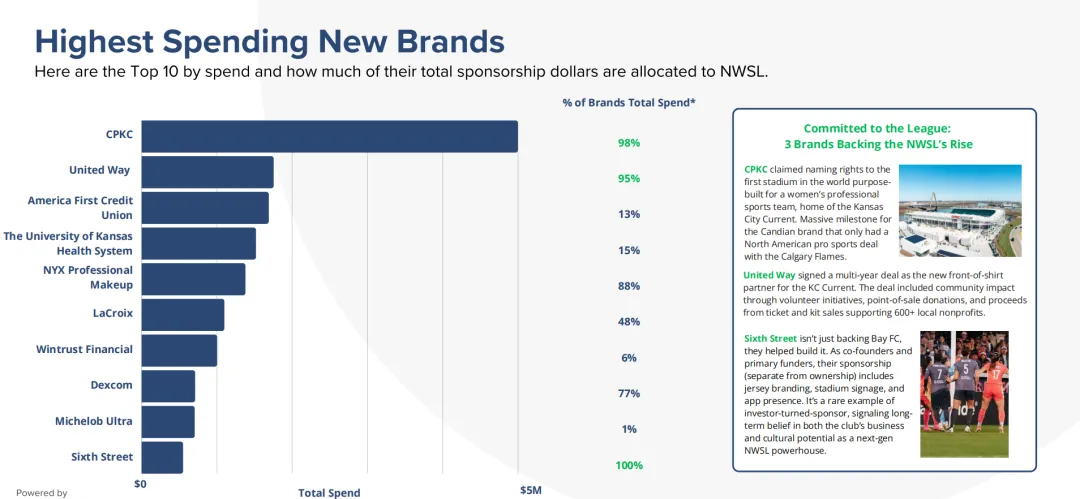 在總投入排名前十的新贊助商中,有3家品牌——CPKC、United Way和Sixth Street,將其體育贊助預算的90%以上都投向了NWSL。不僅如此,聯賽排名前15大的高額贊助合約中,有50%都來自首次合作的新贊助夥伴,這也表明NWSL正獲得越來越多企業的高度認可,成為眾多體育營銷戰略的核心平台。