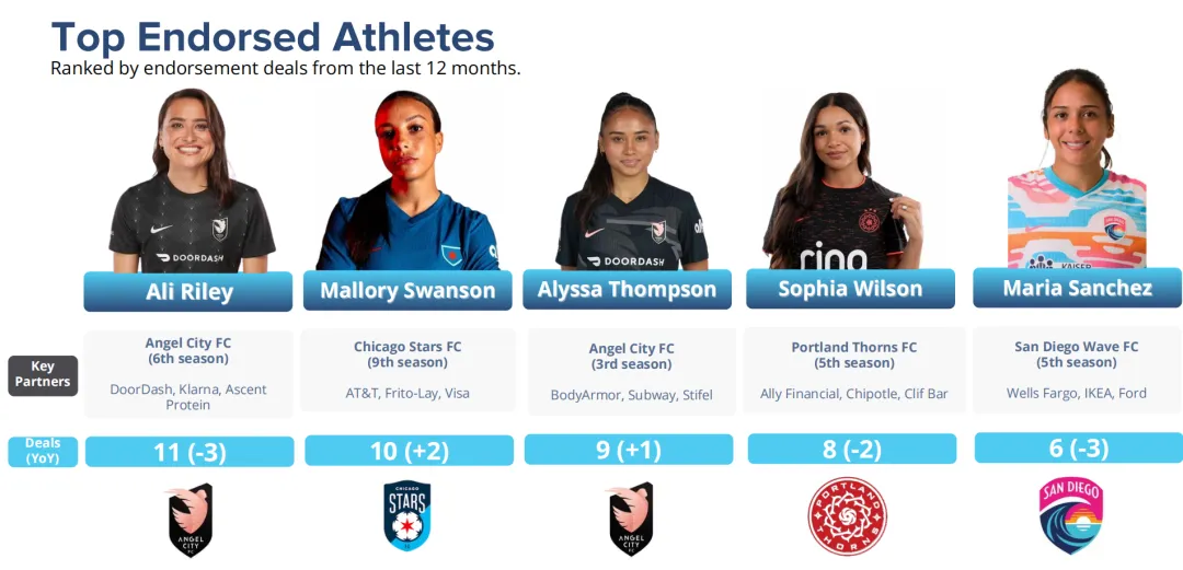 這也解釋了為什麼像阿里·萊利(Ali Riley)這位即將38歲的元老級球員,雖然在社交媒體粉絲數不及NWSL當紅新星,Instagram粉絲數僅位列球員第35名,卻成為聯賽代言最多的球員。
