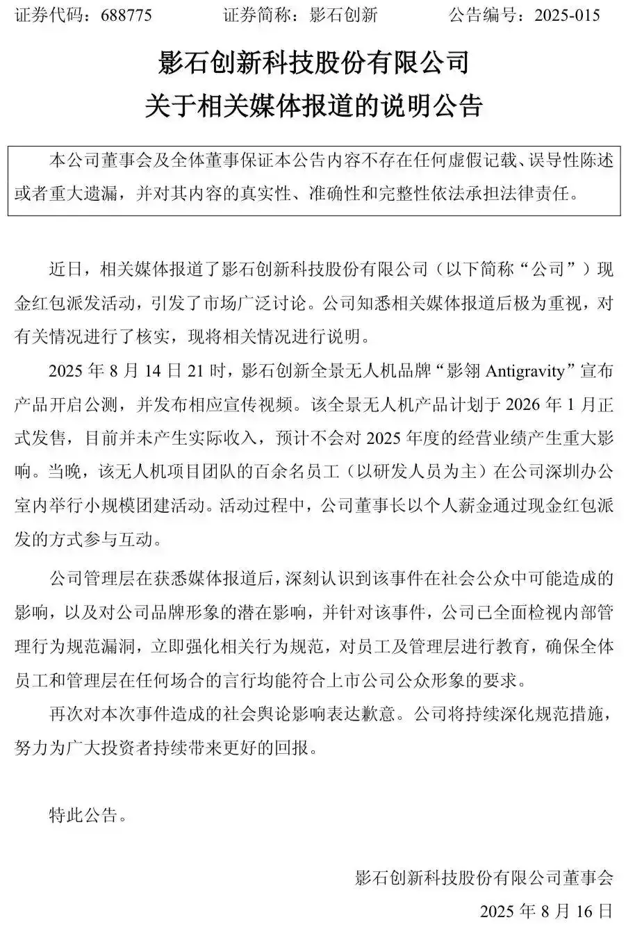 據澎湃新聞報道,公告發布之前,影石創新內部人士曾表示,公司新品研發部門同事連續加班後,於8月14日順利發佈全景無人機A1,項目組組織團建活動慶祝,活動包括小吃飲品,遊戲等環節。團隊都是年輕人,在遊戲環節中,現場撒了一些現金紅包,內部視頻片段流傳出去,造成了一些誤解,我們表示歉意。接下來,我們會以更好的方式激勵團隊,更多的創新回饋用户。