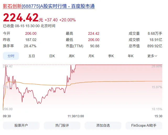 界面新聞報道,8月15日,影石創新股價大漲。截至當日收盤,該股20%漲停,報224.42元/股,市值達到900億元。