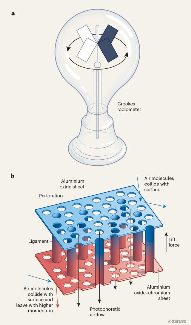 研究團隊使用納米制造技術,設計出一種能在陽光下“飛行”的輕質材料。這種材料由兩層約人類頭髮千分之一厚、釐米見方的氧化鋁薄膜堆疊而成:上層透明,可穿透陽光;下層覆以吸熱的鉻薄層,比上層升温更快;兩層薄膜打滿了對齊的微孔,並通過細絲連接,讓氣體分子從冷側跨越到熱側,形成定向氣流,產生淨升力。
