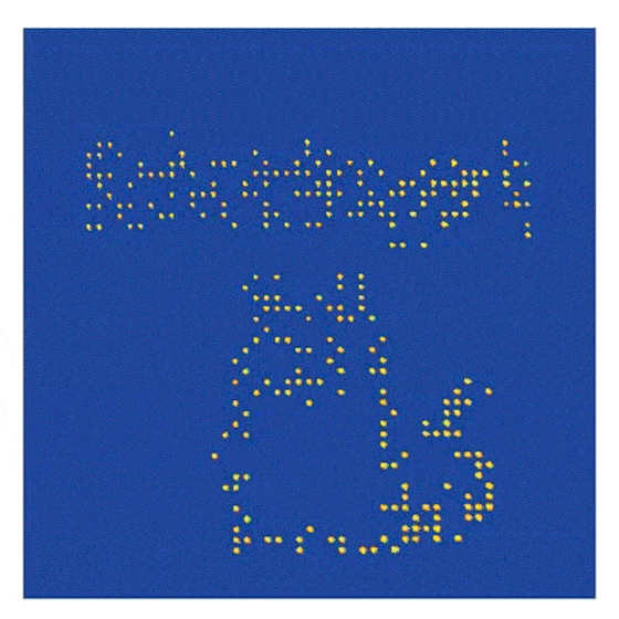 這可能是世界上最小的“貓片”。在上面的動畫中,每個黃點代表一個銣原子,共有549個銣原子。研究人員通過激光束組成的“光鑷”精確操控原子,並使用AI技術加速原子的排列過程,使其在僅230微米寬的陣列內移動,組成了“薛定諤貓”的圖案。