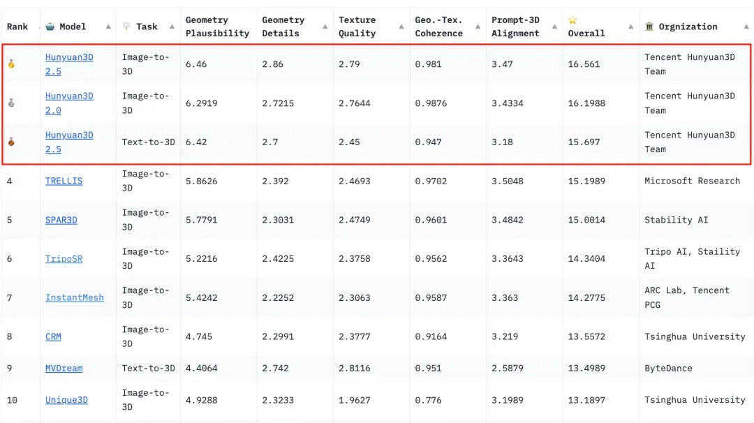 上海人工智能實驗室發佈的全球3D生成模型評測榜顯示,混元3D v2.5一舉奪魁,而混遠3D v2.0開源模型屈居第二。