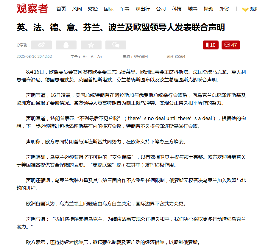 細究這份聯合聲明,與其説是歐洲國家的 “自信表態”,不如説是對自身國際地位的一種掙扎。他們既想在俄烏衝突中掌握話語權,又受制於美俄博弈的大格局。特朗普在阿拉斯加的努力若因這份聲明付諸東流,歐洲恐怕難辭其咎;而對俄羅斯的強硬姿態,讓普京在應對國際局勢時更添戒心,最終可能反噬歐洲自身的安全與經濟利益。