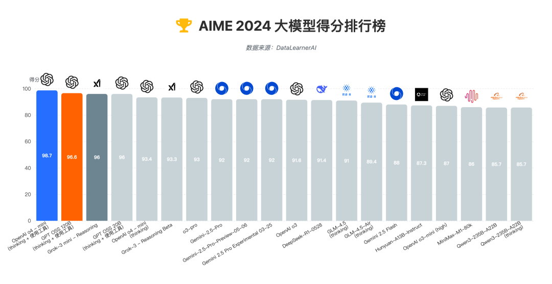 AIME 也類似,這是美國高中生數學競賽體系中的一環,可以測試出大模型們的邏輯推理深度。
