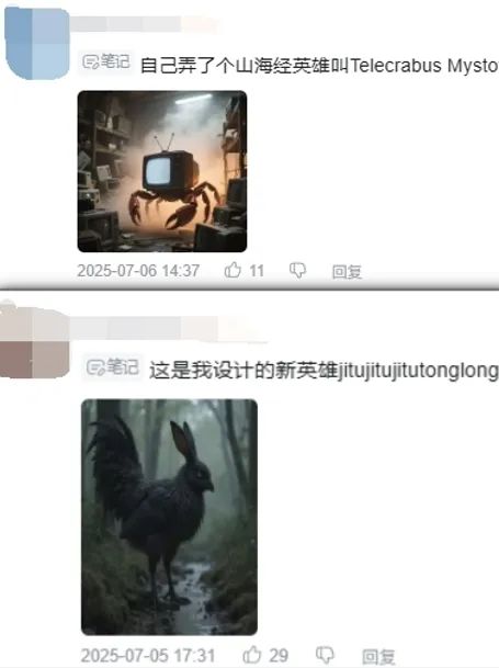 除此之外,神獸粉絲們還會像追星一樣,不計成本地為每隻神獸畫圖、做動畫;在幾乎所有評論區裏,還都能看到人們煞有介事地討論着神獸們的戰鬥力和玩法,就像真的存在一個叫做《AI山海經》的遊戲一樣。