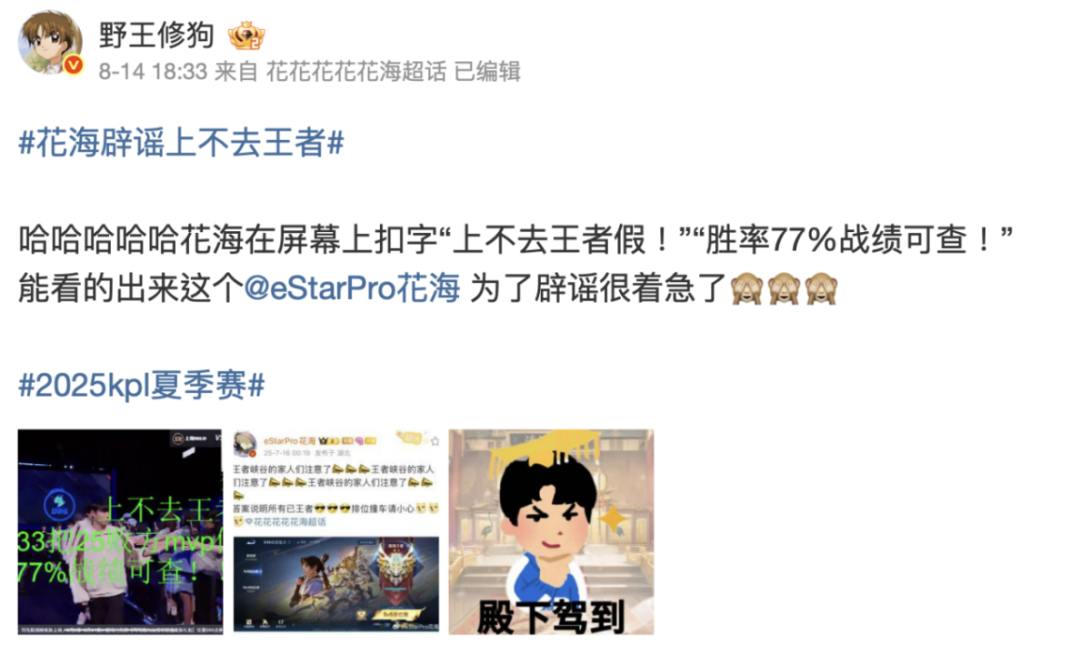 網暴伴隨而來的就是謠言。最烏龍的就是關於“電競選手花海上不去王者”的謠言,最後逼得花海親自直播闢謠,還呼籲大家轉發“上不去王者假!”“勝率77%戰績可查!”的圖片。