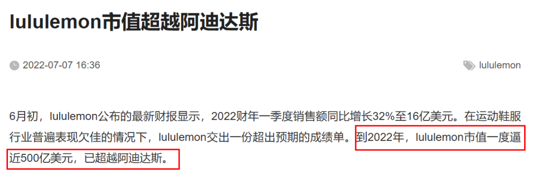2022年7月,lululemon市值一度增長到近450億美元,超越阿迪達斯成為僅次於耐克的運動品牌。