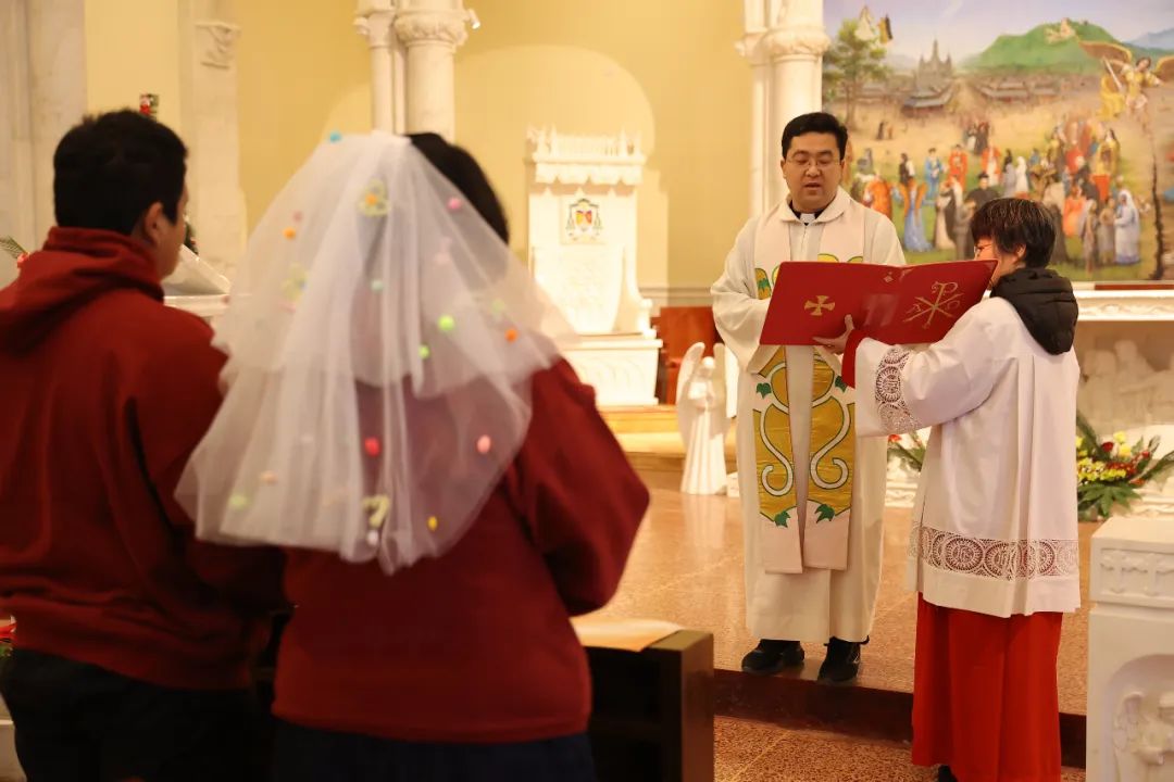 我們的婚禮非常簡單,穿情侶衞衣,Nike板鞋,戴頭紗,請最好的朋友長輩見證,在教堂舉行了一個證婚儀式。儀式結束後一起吃飯。