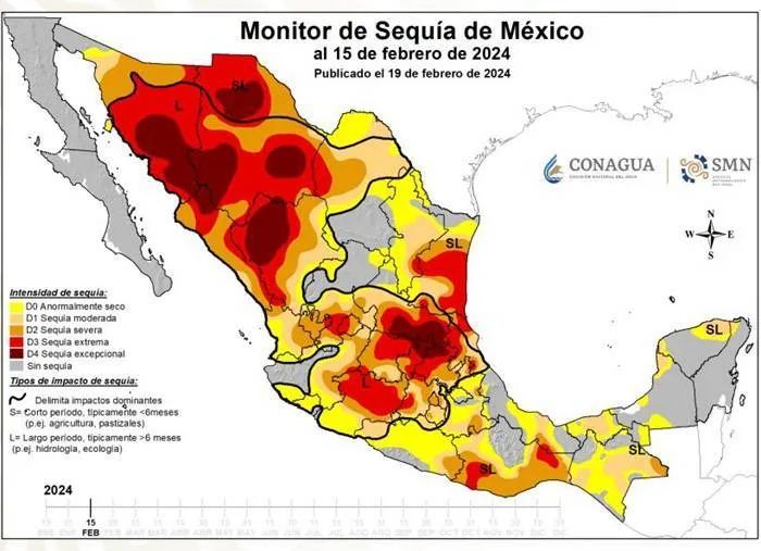 2024年墨西哥乾旱地圖(人口密集區的高原乾旱是最嚴重的地區)。圖片來源:墨西哥國家水利局