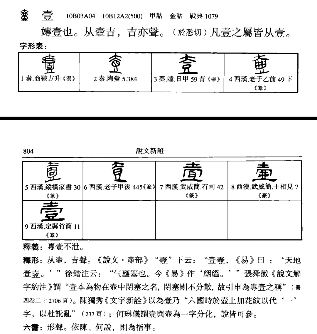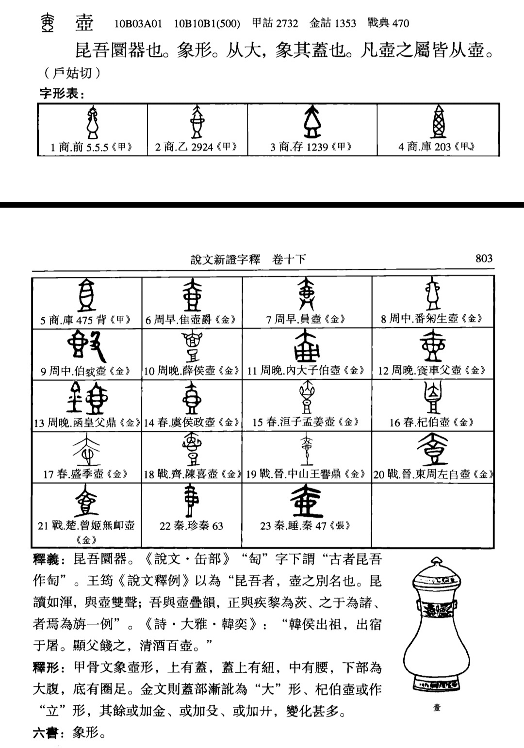 甲骨文、金文【𠁁(壺漏無蓋)壺(有蓋)壹(壺吉)】互為異體分化字。