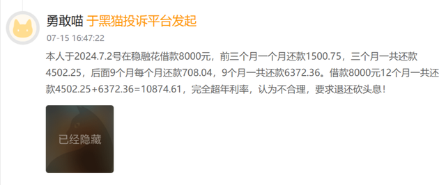 這並不是穩融花的最高放貸利率。有投訴人7月15日稱,他2024年7月2日在穩融花借款8000元,前三個月一個月還款1500.75,後面9個月每個月還款708.04。借款8000元12個月一共還款10874.61。計算可知,年化IRR高達105%。