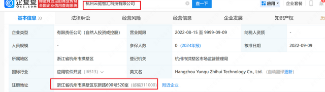 企查查顯示,杭州拱墅區東新路690號520室對應的公司是杭州雲驅智匯科技有限公司,後者成立於2022年8月,股東為葉興淼和楊紹歡。