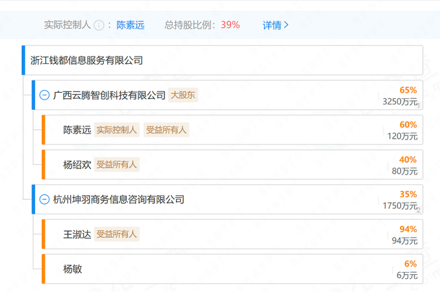 企查查顯示,廣西雲騰智創持有浙江錢都信息服務有限公司65%的股份。浙江錢都信息服務有限公司的前身是P2P平台錢都金服,公司成立於2016年11月,註冊資本5000萬元,法人為蔣真悦。錢都金服曾經背景顯赫,昔日控股股東杭州雲蝶加速投資管理合夥企業持股35%,浙報傳媒控股集團持股30%,浙江融達企業管理有限公司持股20%,浙江文創小額貸款股份有限公司持股15%。值得注意的是,浙報集團通過浙報傳媒控股集團和浙江文創小額貸款股份有限公司合計持股34.5%。