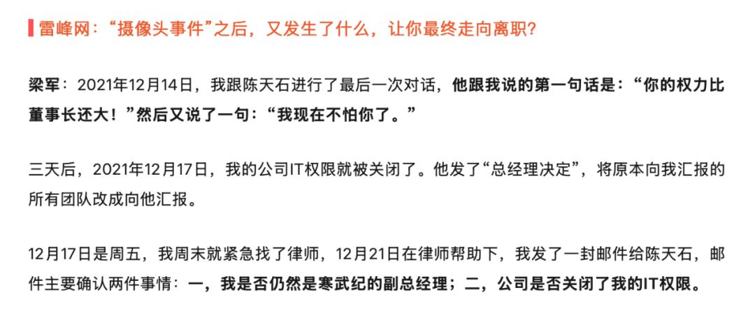 甚至陳天石在辦公室中直接對梁軍表示:“你的權力比董事長還大”“我現在不怕你了”;三天後,梁軍的IT權限被關閉,原本向其彙報的技術與產品團隊被直接劃歸董事長親自管理。