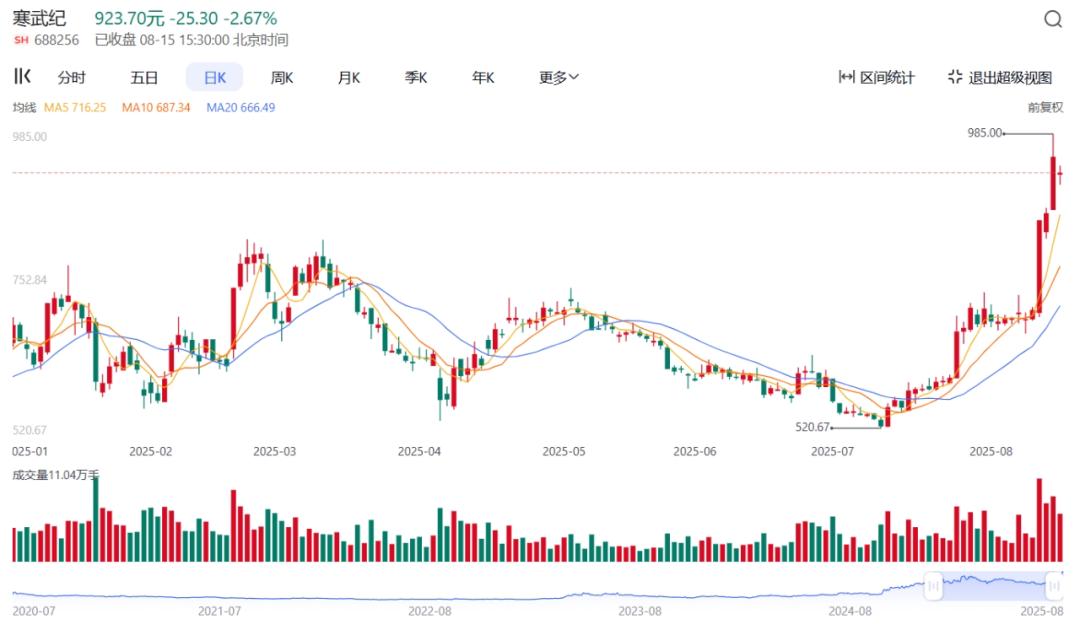 8月14日,寒武紀股價再度大漲,盤中最高價達985元/股,市值一度突破4000億元大關,成為A股半導體板塊當之無愧的“寒王”。這一輪暴漲,不僅點燃了整個AI芯片賽道的市場熱情,也迅速引發了輿論與市場的熱議。